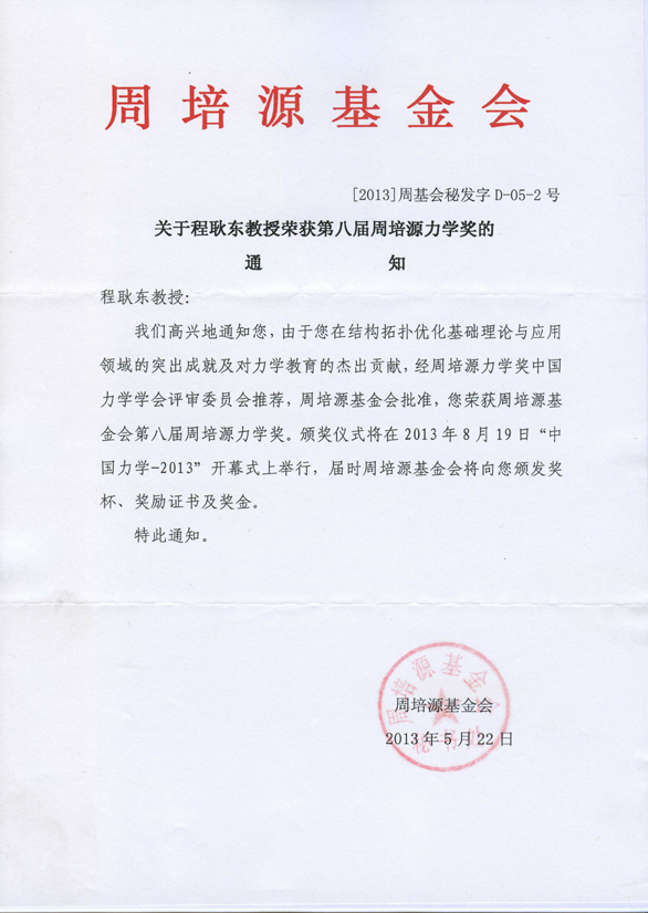 由于在结构拓扑优化基础理论与应用领域的突出成就及对力学教育的杰出贡献,经金宝搏官方app下载指南周培源力学奖评选委员会评审,周培源基金会批准,大连理工大学程耿东院士荣获“第八届周培源力学奖”。颁奖典礼将于2013年8月19日在“中国力学大会-2013”开幕式上举行。