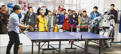 参观者在2015世界机器人大会上与机器人打乒乓球。楠烽摄(人民视觉)